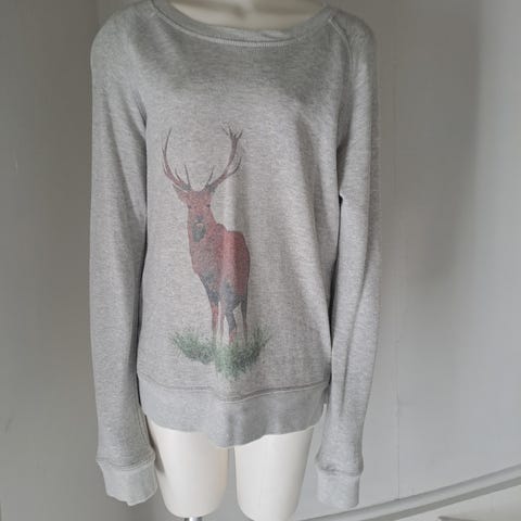 Lett genser med trekvart lange mørkeblå armer og hestemotov. T-skjorte kvalitet, 100% bomull. Det står str 42 i den, men kan brukes fra s - m/l alt etter hvor stor man ønsker å ha den. Jeg vil si den tilsvarer en str 38