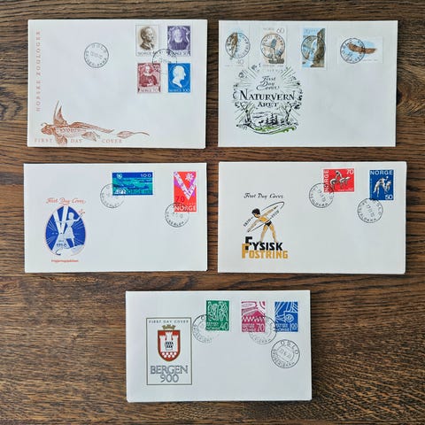 5 førstedagsbrev fra 60/70-tallet selges samlet for 50 kroner.