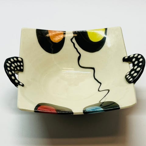 Dette smekre kruset er laget av keramiker Terje Sørli, Årvoll keramikk. Det er elegant i formen, og smalner nedover i en kjegleform. Kruset er i nydelige farger som er typisk Sørli; blå sjatteringer med islett av grønt. Blank og pen glasur, ingen skader eller nagg. Signert under. Høyde: 13 cm. Bredde med hank: 10 cm. Diameter under: 6 cm. Vekt: 232 g