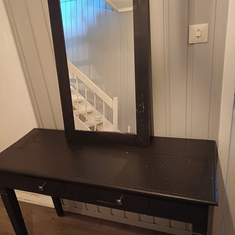 Hei, jeg selger en sminkebord med tungt hjerte, grunn til det er fordi jeg skal flytte til Italia for studie. Den er gul brun i fargen, den har to småe skuffer øverst og under så har den tre store skuffer. Du kan ha sminke belysning på det sminkebordet. Du kan også male den etter eget ønske, jeg valgte å beholde originale fargen som jeg syns er mer antikk og fint. Ved interesse må varen hentes før 20.08, jeg drar på studie i utlandet og blir i utlandet i et år. Ved interesse send meg en melding.