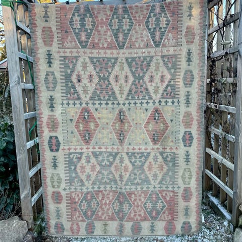 Dette er et spennende klassisk kelimteppe, hådvevd med opprinnelse fra anatolia, Tyrkia. Det skaper liv og dybde til interiøret, og kelimen vil være et vakkert blikkfang hvor enn den ligger. Du finner kelimen hos Bohemliv.no, der er det fri frakt på alle kelimtepper og kelimputer. Om du ønsker å se teppet på Nesodden, så ta gjerne kontakt! Akkurat nå er det mange nye kelimer i nettbutikken. Alle kelimene jeg har er nyrenset og klar til bruk.