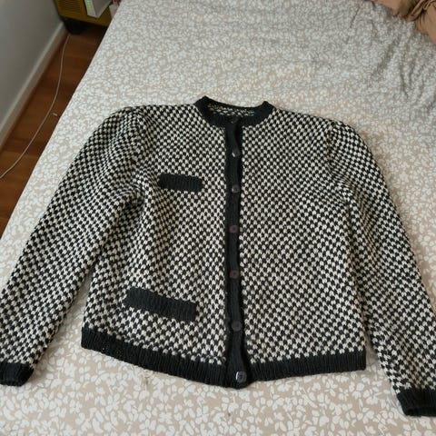Super fin jakke som passer til det meste, jeans, dressbukser, kjole/skjørt eller shorts flerfarget, med lommer foran og knapper. Frynsete kant. Super fin og som NY!