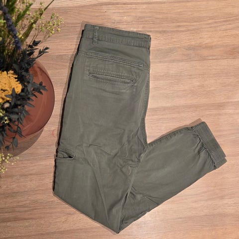 Selger en cargobukse fra Redefined Rebel i fargen "thyme" (olivengrønn).