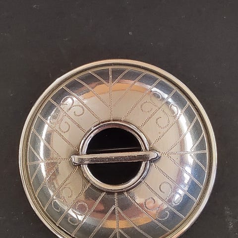 Støpt tinnskål, ubrukt. Diameter 14 cm.
