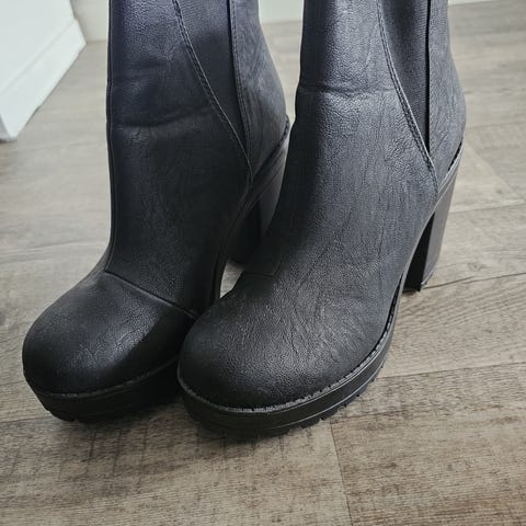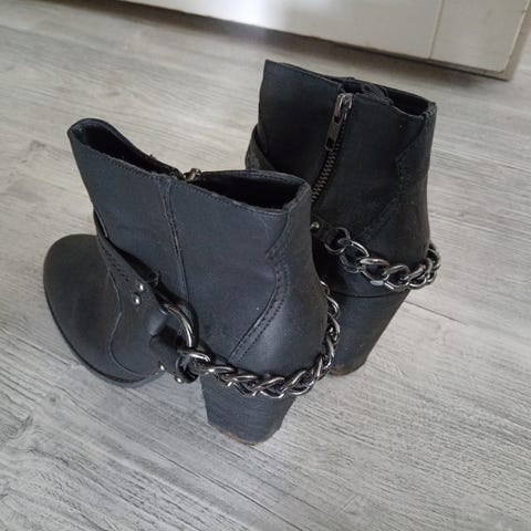 Ankelstøvletter med hæl for dame i størrelse 39. Støvlettene er svarte og går til ankelen, med blokkhæl og rund tå. De har glidelås på siden for enkel av- og påkledning, samt dekorrem med spenne på skaftet. Egner seg til bruk i hverdagen og til mer pyntede anledninger.