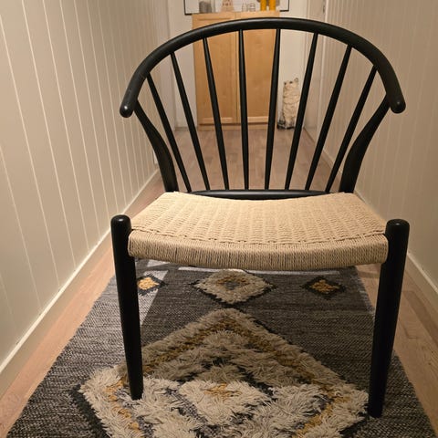 Pent brukt loungestol, CH44 fra Carl Hansen & Søn designet av Hans J. Wegner. Noen små hakk ved bena og litt bruksslitasje på armlenet. Selges med putesett i ull (Hallingdal).