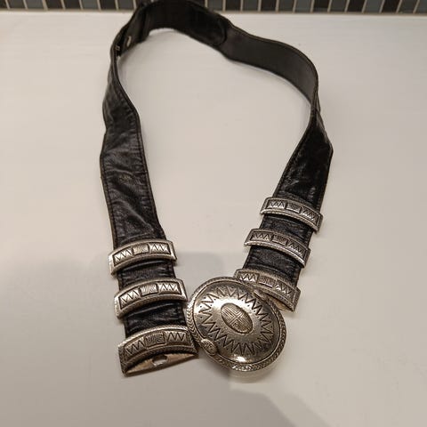 Damebelte i brun skinn med metallspenne og dekorative nagler. Beltet har justerbar lengde og er egnet til hverdagsbruk. Sender, kom gjerne med bud.