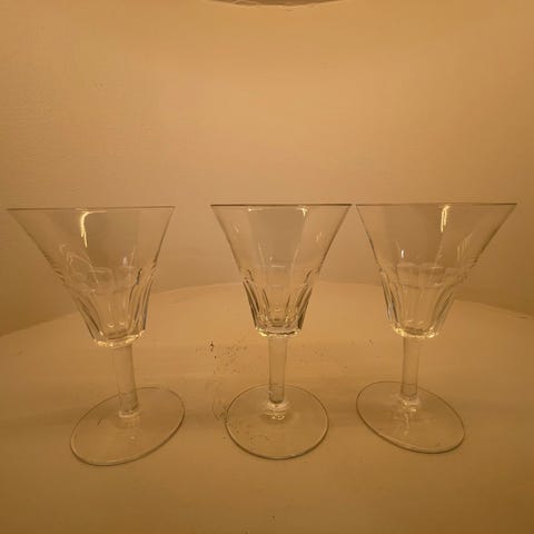 Glasskaraffel fra Hadeland Glassverk med stjernemønster i bunnen og fasettslipt bånd. Høyde 22, diameter (nederst) 10. Ukjent produksjonsår.