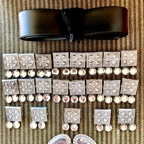 Sort skinnlist med 23 beltestøler med trådkantlauv, oksidert, en veskestøl, oksidert samt beltespenne med kruser og syhol, oksidert.