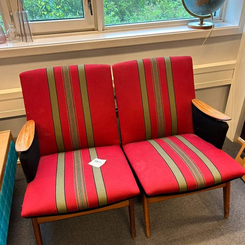 Interiørstoler som er vintage! De er brukt, men sjarmen ved disse stolene er at de er like fine selvom de er godt brukt (noen bruksmerker). Mulig de kan renses og pusses, men personlig synes jeg det ødelegger sjarmen til de fine fargene!