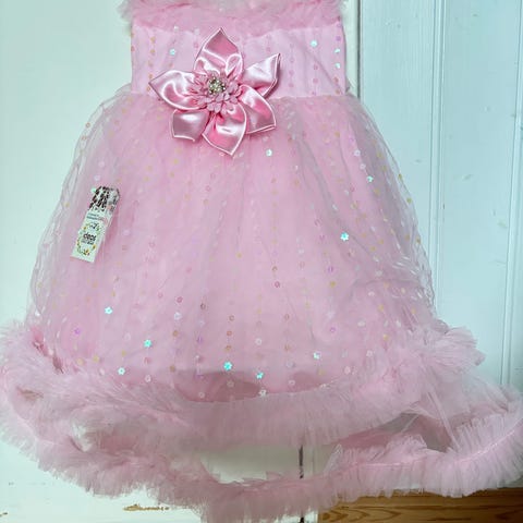 En skikkelig prinsesse kjole med flere lag tyll. Glidelås bak og knyting.