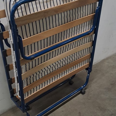 Praktisk gjesteseng som kan brettes sammen. Sengen har hjuler som gjør at man slipper å bære.