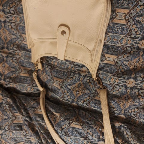 Lang skulderreim følger med. Beige farge m gulldetaljer. Romslig veske modell med plass til mye, laptop, papirer og permer.