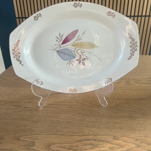 Stort ovalt serveringsfat, stemplet Egersunds Fayancefabrik Norsk 12 12, dekor Blomkarse (produsert 1937-1940, 1954-1955)