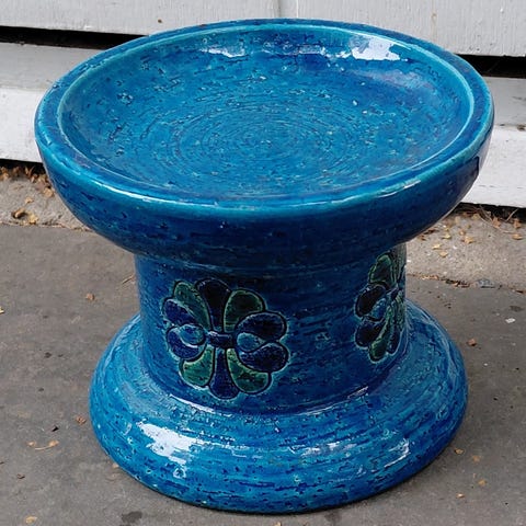 Nydelig Bitossi krukke med lokk. Blåfarget keramikk med mønster rundt nedre del. Flott lokkeknopp. Høyde ca 22,5 cm inkl lokket, diameter ca 15 cm. En liten bit med glasurglippe på kant , vanskelig å se så jeg har lagt ved et forstørret bilde. Krukken er blåfarget innvendig. Flott størrelse og blikkfang som dekorobjekt.
