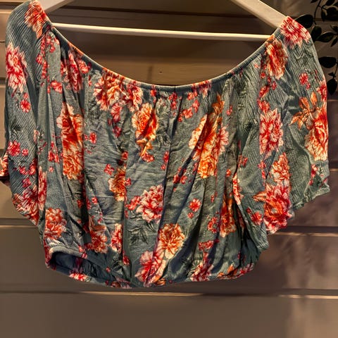Søt Crop top i svart med blomstermønster. Perfekt til bohemstil i sommer. Strikk oppe og nede. Fin til off shoulder look. 100% viskose.