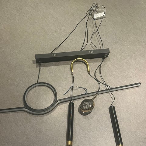 Vi selger vår taklampe som har lyst opp mange hyggelige middagsselskaper. Bildene er fra vårt forrige sted hvor den hang oppe, men er nå demontert og fraktet til vårt nye hjem hvor den dessverre ikke passer. Det følger med 3 stk lyspærer med glødetråd/mønster. PS! Lampen ser mye bedre ut hengende fra tak fremfor liggende på et gulv ;-)