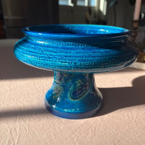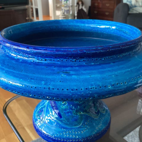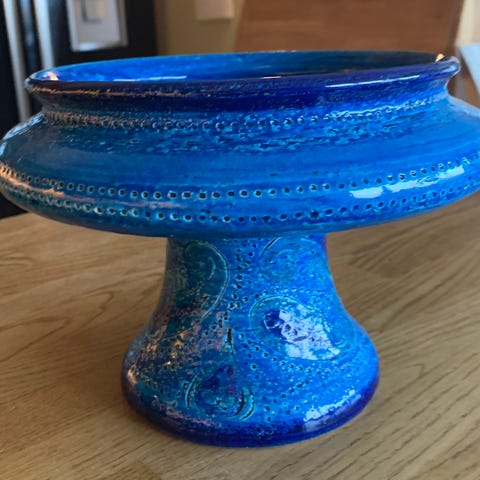Designet av Aldo Londi, med har flere lag glasur i blåtoner og håndskårne mønstre.