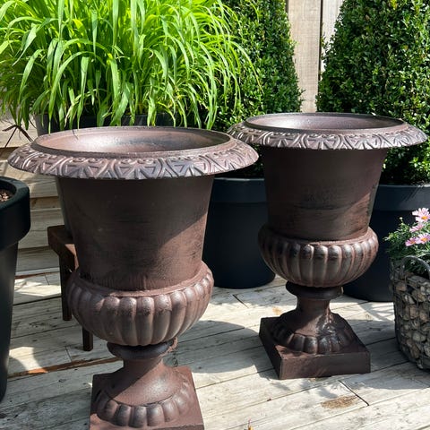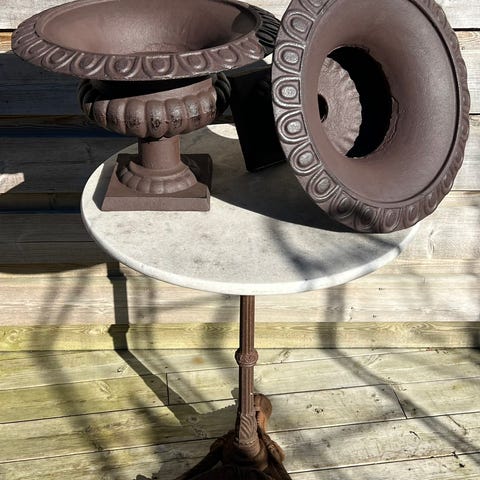 Delikate støpejern urner. De er 30 høye og Ø 23cm. Pris 550,- pr stk. Uten blomster. Kan hentes i Sarpsborg eller sendes hvis kjøper betaler frakt. Ta også en titt innom mine andres annonser på Finn🌸