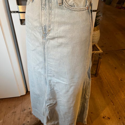 Langt skjørt i lys denim med innfelt mørk denim. Frynser nede. Er Str S men er som Str M.