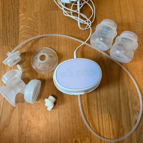 Brystpumpe fra Philips Avent selges. Den kan brukes med batterier eller koblet til strøm. Det følger med massasjepute i to forskjellige størrelser, den i størrelse large er ubrukt. Pumpen kobles på flaske ved bruk, eller til oppbevaringskopper via adapter. En flaske og 6 kopper med lokk følger med, og to adaptere. Koppene kan fryses, brukes i mikrobølgeovn og vaskes i oppvaskmaskin.