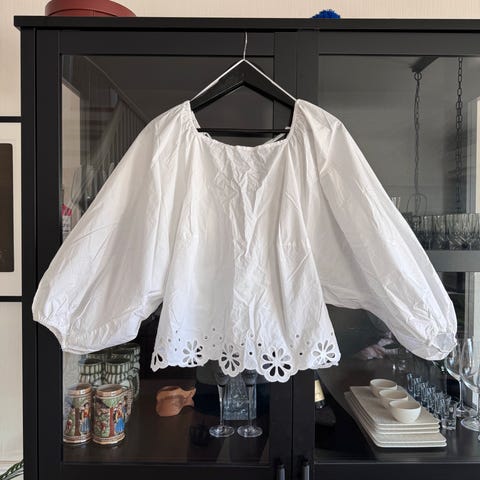 Fin sommerlig topp med sommerfugler i klassisk svart og hvitt. 100% viskose. Kledelig v-hals. Brukt 1 gang.