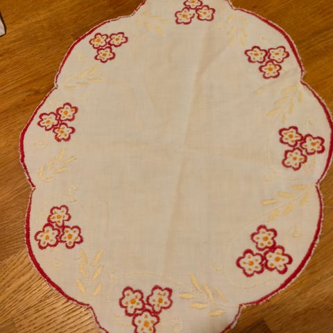 Fin vintage, liten duk med blonder rundt selges.