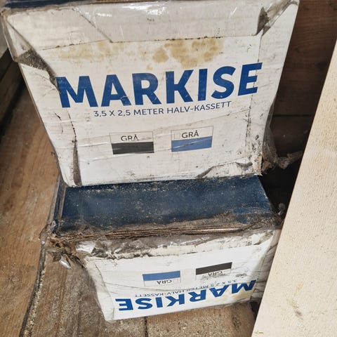 Lite brukt markise selges til halv pris. Dovre, produsert av Omega Industri. Med fjernkontroll og sveiv. Kan brukes på vegg og fra tak.