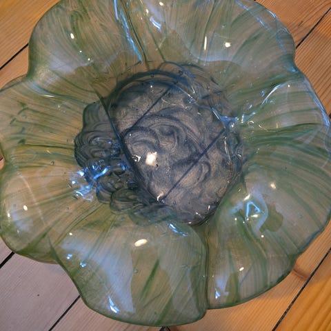 skål laget i turkis glass med diameter på 24 cm. Skålen har en rund form med en sentral forhøyning i bunnen. Egnet som dekorativt element.