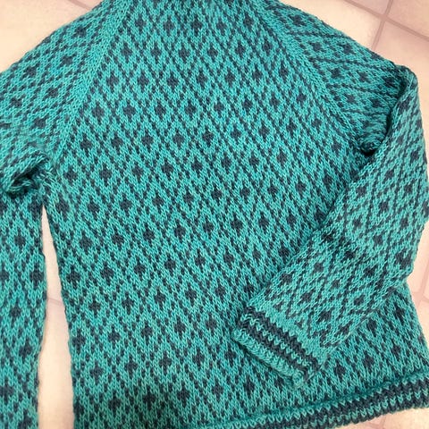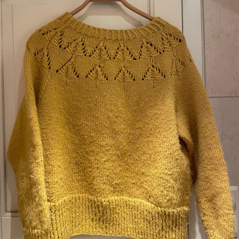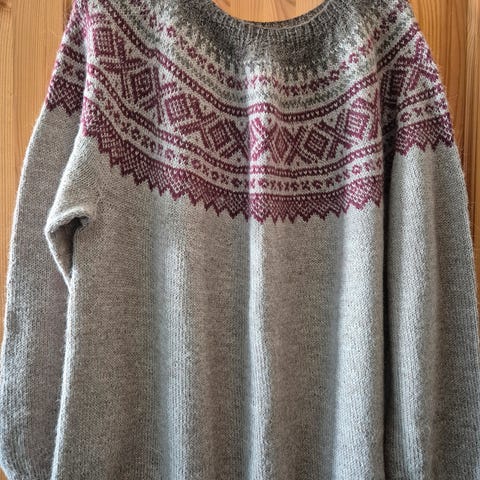Hjemmestrikket i god ull. Passer en M /L dame.