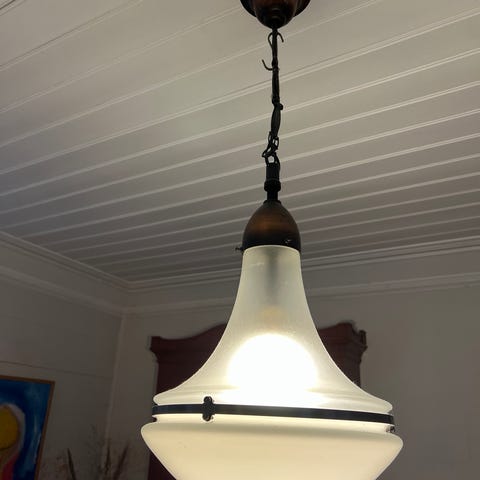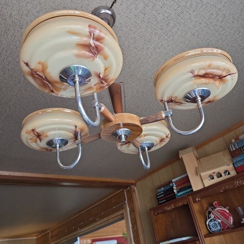 Flott taklampe i messing, teak og glass. Alle glasskjermene er hele. Messingen har naturlig «anløp».