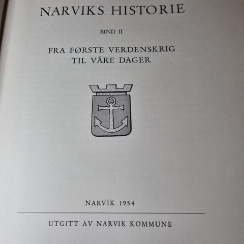 Bokverket "Narviks historie" av Nils A. Ytreberg i 2 bind. Utgitt av Narvik kommune i årene 1953-54. Bindene er på hhv. 468 og 455 sider. Papiromslaget er rufsete. NB: Tobakkslukt. Vedlagt kart over Narvik i bind 2.