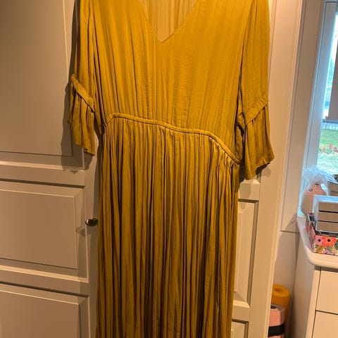 Fin gulfarge som er aktuell nå. 100% viskose. Sjult glidelås i siden. Den er blitt for stor til meg. Nydelig kjole som passer til flere anledninger.