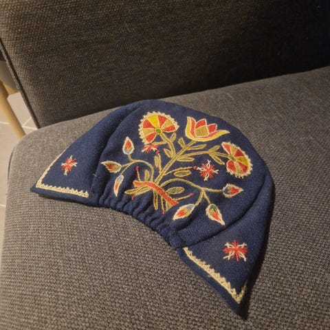 Bunadslue til Vestoppland bunad. Ble sydd til min bunad i 1985, men er aldri blitt brukt. Helt ny. Selges kr. 500.