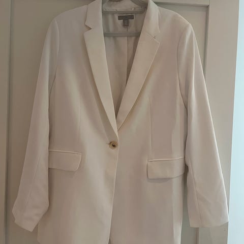 Jeg skal selge en hvit blazer fra Juicy Couture. Den har god stretch og er behagelig å ha på. Det er skulderputer på jakken.