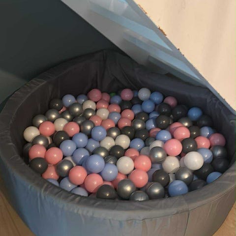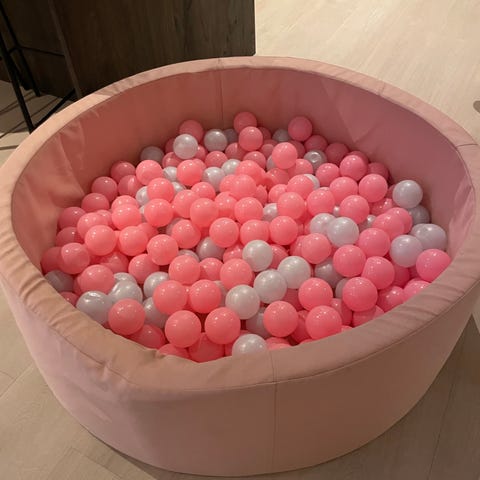 Rosa Ballbinge med ekstra pose med baller. Godt brukt men pent brukt. Ballbinga var rund men da jeg vasket og da satte på trekket sist så bare ble den sånn. Men forstyrrer ikke lek og morro.