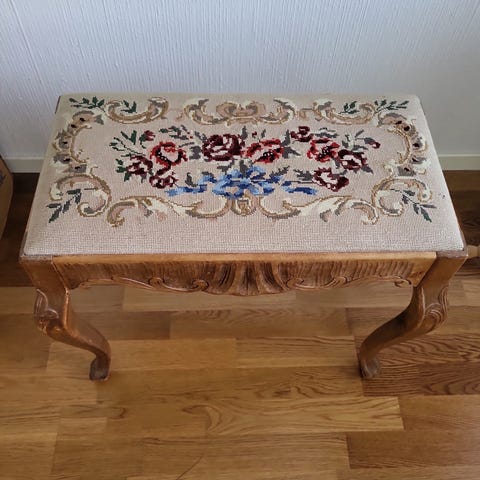 Gammel fin Fin krakk / puff / skammel med pute i beige velour stoff . nagler rundt kanten