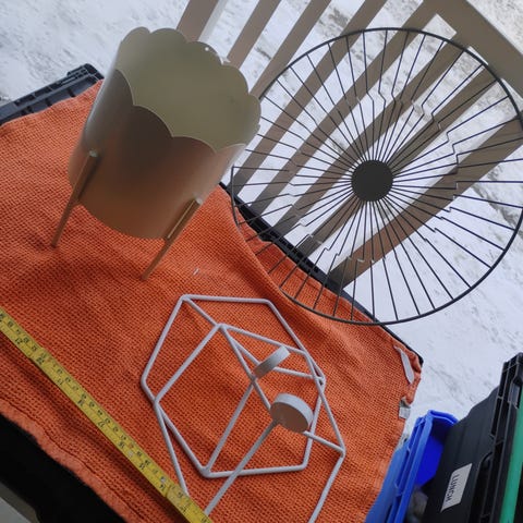 Småkaker fat, fat for smykker, for noe å stille ut..fantasien stopper. Laveste er ca 40 cm høy, høyeste er ca 52 cm høy. De er gamle, små bruksmerker på metall.