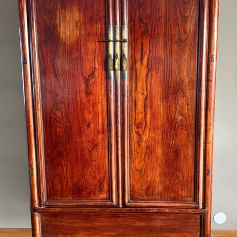 Ukjent merke rattan skap med to dører i naturfarget tre. Skapet har flere hyller og en hengestang for oppbevaring. Materialet er flettet rattan kombinert med tre, egnet for oppbevaring av klær og andre gjenstander.