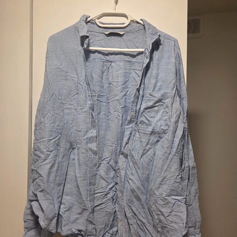hvit skjorte med blå striper og et erme på den ene skulderen