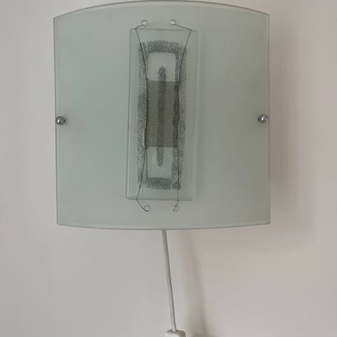 Fin vegglampe med et svakt skrapemerke som nesten ikke synes, bare når en vet om det.