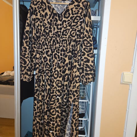 Selger dansekjole med leopard mønster da den ikke blir brukt lengre. Kun brukt et par ganger. Lange ermer, folder i skjørtet, sort belte som er sydd på kjolen og noe utringet i ryggen. Passer alt fra S-L, da den er ganske stretchy.