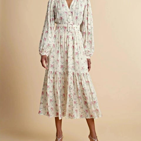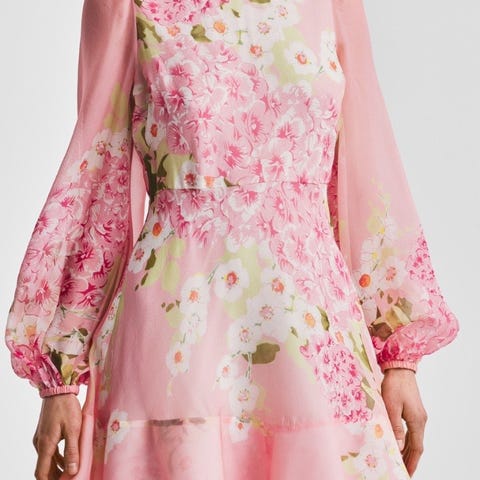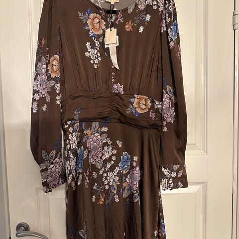 Vakker viskosekjole med blomsterprint i rosa/rødtoner. Kjolen har rund hals og lange ballongermer med rynkesømmer samt strikk i enden. Perfekt lengde til midt på låret og markert liv med strikk i livet.