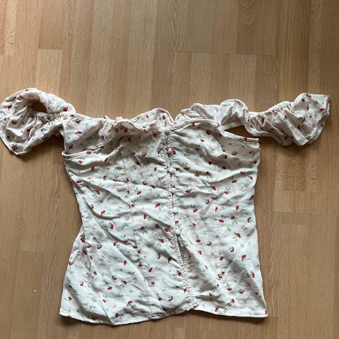Bunnfargen er krem og det er blomster i rød/rosa farge.