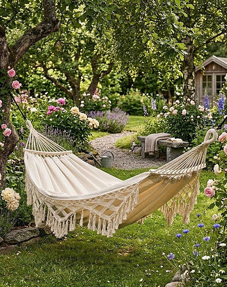Flotte og praktiske hengekøye med frynser. Nå kan du lage din egen lille oase i hagen eller på terrassen.