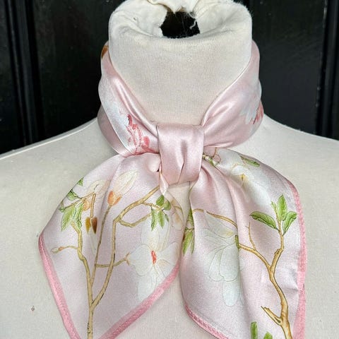 Nydelig rosa skjerf med epleblomster. Mykt og behagelig. 100%silke. Veldig fin silke i skjerfet, da det er er mulberry silke som er den beste silke kvaliteten. Enkelt å dandere på ulike måter da silken er så fin. Helt nytt. Størrelse 53x53cm. Kan gjerne sende med posten til 31.-