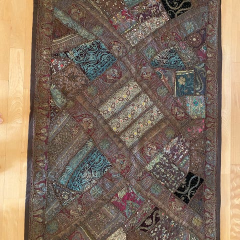 Veldig pent indisk teppe med broderi. I burgunder og lilla.