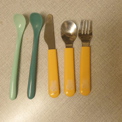 Pia & Per bestikk "hjerte". Stålbestikk med sølv og emalje. Har ikke vært i bruk. Små riper som synes på nært hold kan likevel forekomme