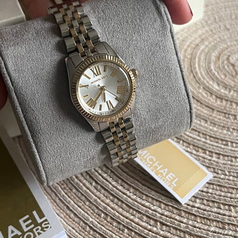 Michael Kors klokke ‘Runway’ Sølvfarget/Stål Ø34 mm. Den er pent og lite brukt, kan ha noe små riper på baksiden men ellers helt fin. Batteri må byttes.