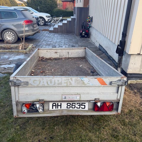 Tredal tilhenger uten skilt. Helt i orden på det elektriske, men ett dekk samt treplater må byttes.